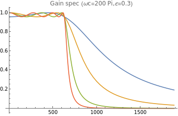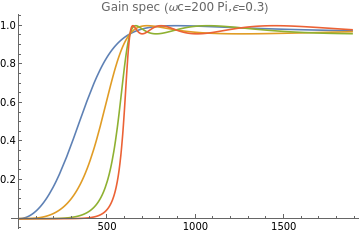 Plot[{Abs[H[2,I*ω]],Abs[H[3,I*ω]],Abs[H[5,I*ω]],Abs[H[7,I*ω]]},{ω,0,3*settings[["ωc"]]},PlotRangeFull,PlotLegends{"n=2","n=3","n=5","n=7"},PlotLabel"Gain spec (ωc="<>ToString[settings[["ωc"]]]<>",ϵ="<>ToString[settings[["ϵ"]]]<>")"]