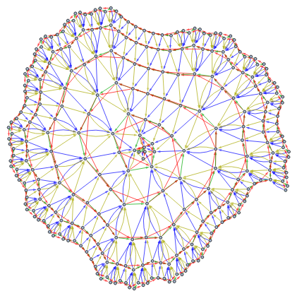 The color of the edges represent the order of the calls. Red is the first call, blue is the second, green is the third and yellow is the fourth. The number of times a function calls itself is thus depicted by the colors of the edges.