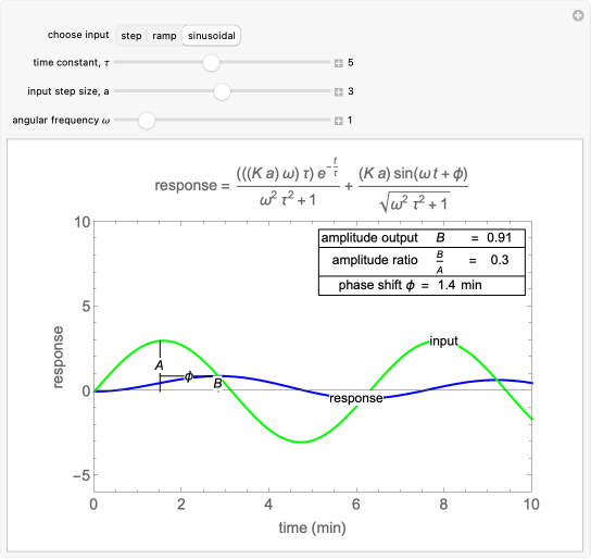 This Demonstration shows the responses to a first-order transfer function. You can vary the magnitude of the input and the time constant . The time constant is related to how long a system takes to reach the new steady state. The input can be a step function, a ramp, or a sinusoidal input.