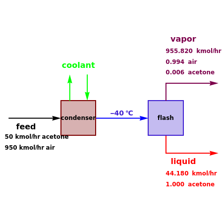 Consider a stream composed of a mixture of air and acetone with a molar flow rate of 1000 kmol/hr. The acetone content in this stream is only 5 mole%. It is still possible to recover the acetone from air using a cryogenic process, using very low temperatures in the range to . This separation can also be called partial condensation since only acetone will condense in this temperature range. Thus, the liquid phase that exits the process will be almost pure acetone. A approach temperature is chosen, which allows the determination of the isothermal flash temperature from the user-set value of the coolant temperature. The Demonstration displays the flow rates of the liquid and vapor stream that exits the flash drum as well as their compositions. One can see from the snapshots that the percent recovery of acetone can reach almost 100% (i.e., the liquid flow rate approaches 50 kmol/hr) when the coolant temperature is very low. This process is an alternative to countercurrent absorption of acetone in a column using water as a solvent.