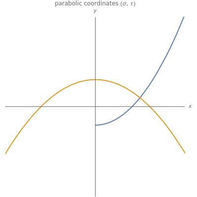 Note that most descriptions of parabolic coordinates do not include the term and restrict the domain of to . However, this is ambiguous since the two points then map to the same . By including the term we avoid this ambiguity so that corresponds to the left half-plane and to the right half-plane.