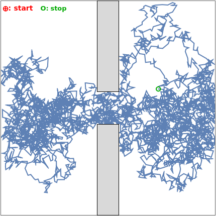This Demonstration simulates a random walk of a particle constrained within a square. An impermeable wall divides the square into two equal parts and has a central opening that lets the particle move between the two halves.