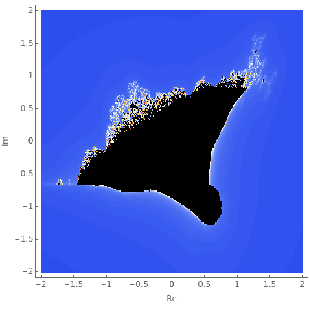 Iterate =+c,=0 to generate the Burning Ship fractal. Black points correspond to values of for which the iterates of 0 remain bounded. Other points are colored based on how long the iterates of 0 stay bounded with that value of .