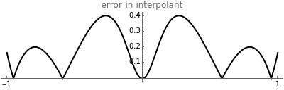 Runge's phenomenon illustrates the error that can occur when constructing a polynomial interpolant of high degree. The function to be interpolated, , is shown in orange, the interpolating polynomial in blue, and the data points in red. The difference between the interpolant and the function is shown below.