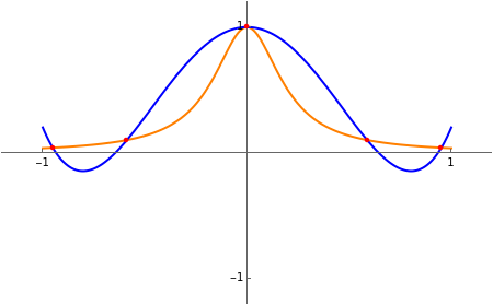 Runge's function is given by . When this function is sampled at equally spaced points in the range , as the number of sample points increase the error difference theinterpolating polynomial and the function grow without bound. When Cheybshev points are used the error diminishes as the number of points increases.