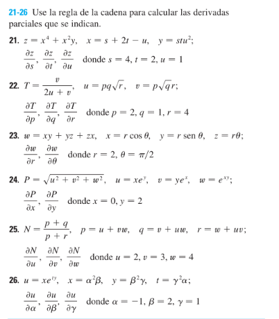(*Definicióndelasvariables*)ClearAll[z,x,y,s,t,u]x[s_,t_,u_]:=s+2t-uy[s_,t_,u_]:=stu^2z[s_,t_,u_]:=x[s,t,u]^4+x[s,t,u]^2*y[s,t,u](*Derivadasparciales*)dzds=D[z[s,t,u],s];dzdt=D[z[s,t,u],t];dzdu=D[z[s,t,u],u];(*Mostrarlasderivadas*)dzdsdzdtdzdu(*Evaluaciónenelpuntodado:s=4,t=2,u=1*)dzds/.{s->4,t->2,u->1}dzdt/.{s->4,t->2,u->1}dzdu/.{s->4,t->2,u->1}