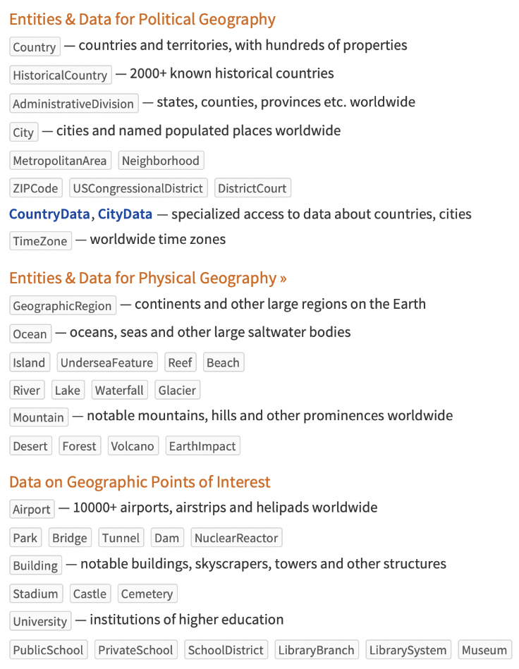 Entities in WL represent named things that the language knows about, and can perform computations with. Type “ctrl+=” to start discovering entities: