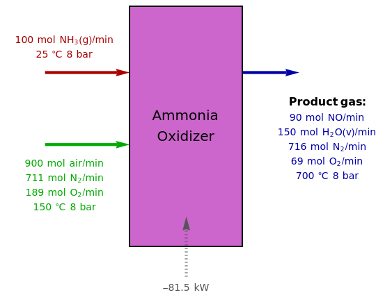 Ammonia is oxidized by air to form nitric oxide, as the first step in the production of nitric acid. The two principal reactions that occur are (reaction R1) and (reaction R2). The inlet and outlet conditions are given in the reactor's flowchart. You can set the temperature of the outlet stream. The extent of reaction R1 is =22.5mol/min, while the extent of reaction R2 is =5.0mol/min.