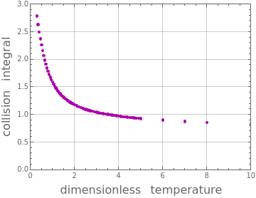 p1b=ListPlot[data,Frame->True,GridLines->Automatic,AspectRatio->0.75,ImageSize->Medium,FrameLabel->{Style["dimensionless temperature",16],Style["collision integral",16]},PlotStyle->Darker@Magenta,PlotRange->{{0,10},{0,3}}]