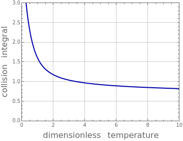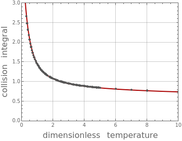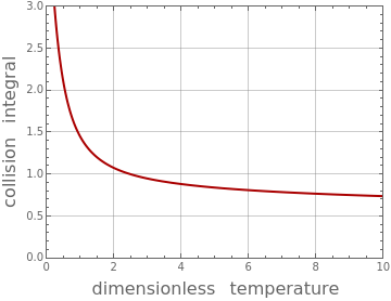 p2=Plot[OMEGA11,{TS,0.05,15},Frame->True,GridLines->Automatic,AspectRatio->0.75,ImageSize->Medium,FrameLabel->{Style["dimensionless temperature",16],Style["collision integral",16]},PlotStyle->Darker@Red,PlotRange->{{0,10},{0,3}}]