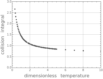 p1=ListPlot[data,Frame->True,GridLines->Automatic,AspectRatio->0.75,ImageSize->Medium,FrameLabel->{Style["dimensionless temperature",16],Style["collision integral",16]},PlotStyle->Darker@Gray,PlotRange->{{0,10},{0,3}}]