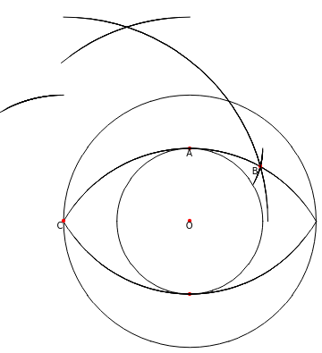 With a ruler and compass, an eye is easy to construct, leading to a regular pentagon construction. First draw a unit circle centered at O, the pupil. With centers at the top and bottom of the pupil, draw two circles of radius 2 to form the eyelids. Using the top of the pupil (A) as the center, draw an arc of radius 1 (AO) to intersect the upper eyelid at B. With C as the left corner of the eye, draw an arc with radius OC, and then a larger arc with radius BC. Draw a final arc with radius BC centered at O. Connect the intersection points for the pentagon.