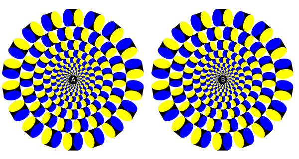 This Demonstration shows an optical illusion produced by circles in a stationary image appearing to spin. After manipulating several attributes such as color and number of layers, you will find that the illusion is most effective with highly contrasting colors and a large number of layers. In addition, it is necessary to display two figures side by side so that the viewer's gaze switches back and forth between them, giving the illusion of spinning in the viewer's peripheral vision.
