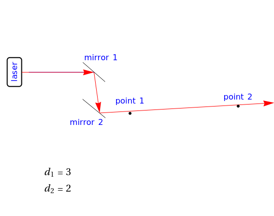 This Demonstration shows a step-by-step procedure for directing a laser beam through two points by turning two mirrors. The vertical distances between the initial beam and the points 1 and 2 are denoted and .