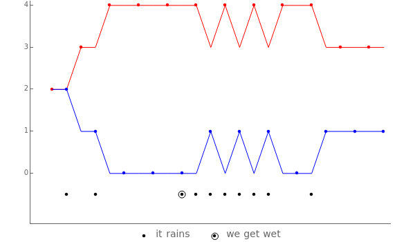This Demonstration shows sample paths of the number of umbrellas at home and work. The red and blue points on the paths show which location the man currently is leaving; the paths start at home. The black points at the bottom show if it is raining. The man gets wet if it is raining and he has no umbrellas at his current location. The Demonstration also shows the average number of walks until the man first gets wet.