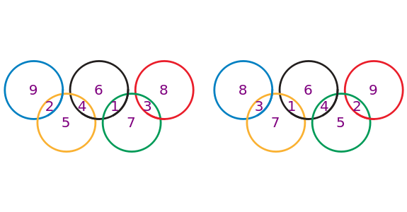 http://demonstrations.wolfram.com/PandigitalOlympicCirclesPuzzle/