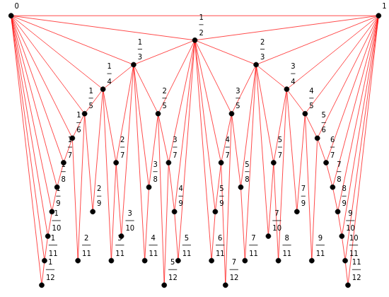 The Farey tree contains all the irreducible rational numbers between 0 and 1. It is constructed in stages consisting of the rationals with and . Each "child" is obtained by using Farey addition. A vertex labeled with is the child of the vertices and if .