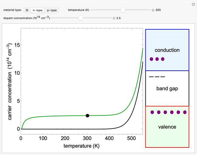 This Demonstration shows the charge carrier concentration in silicon (Si) and doped Si (n- and p-types) as a function of temperature and dopant concentration. The corresponding electron band configurations are shown to the right of the plot. Phosphorous doping creates n-type Si, while boron doping creates p-type Si.