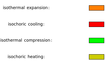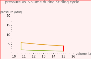 A Stirling engine takes advantage of the thermodynamic properties of compression and expansion of gases to produce work. This Demonstration tracks the changes in pressure (atm) and volume (L) of the working fluid during a reversible Stirling cycle as it cycles through the four characteristic thermodynamic steps: