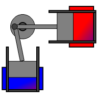 Accompanying this is an animation of the alpha-type engine, as well as work produced per cycle (J) and Carnot efficiency of the engine. The alpha-type Stirling engine is functionally equivalent to other Stirling engines, but has two pistons in separate cylinders, one with a heater (red), the other with a cooler (blue), that are connected by a heat regenerator (not shown in the animation).