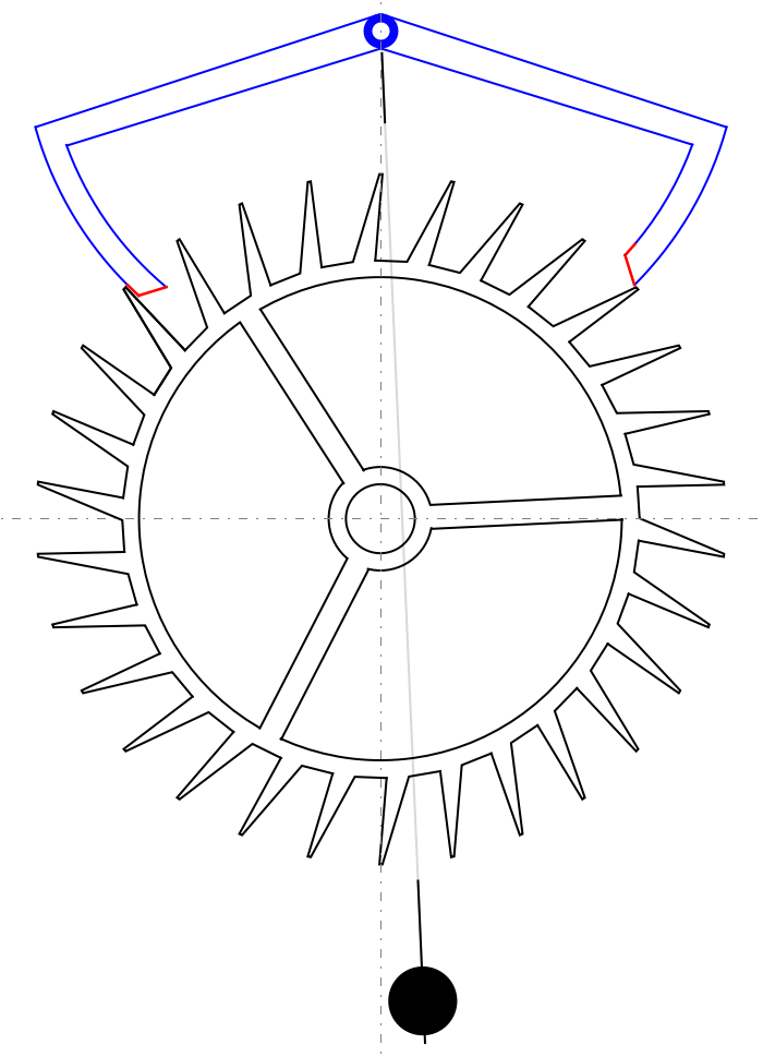 The escapement in this Demonstration is the Graham dead-beat escapement. The wheel is stopped by the anchor's pallets (lock phase) and remains stationary up to the instant of its unlocking (impulse phase).