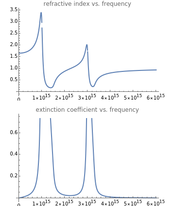 The Lorentz oscillator model can account for the response of material bodies to electromagnetic waves. The model assumes that the electrons can be simulated as atomic oscillators. Thus an incoming monochromatic electromagnetic wave can cause the valence electrons to oscillate harmonically. This behavior of the material is characterized by the dielectric constant, which can be related to the refractive index and extinction coefficient. In this Demonstration, these optical properties of the material are related to the selected parameters of the atomic oscillators and plotted as functions of the radiation frequency.