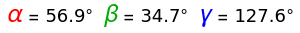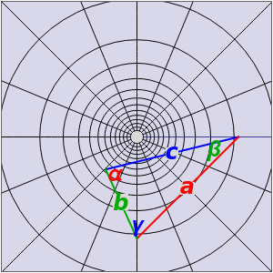 Spherical triangles with sides , , and angles , , , all expressed in degrees, are shown on a hemisphere and on a gnomonic projection. You can drag the vertices. The triangles conform to spherical analogs of the law of cosines, and also , with two other cyclic permutations for each. The spherical law of sines has the form . The sum of the angles of a spherical triangle is greater than 180°, and it is useful to define the spherical excess . The area enclosed by a triangle on the unit sphere, as well as the subtended solid angle, is equal to , expressed in steradians.