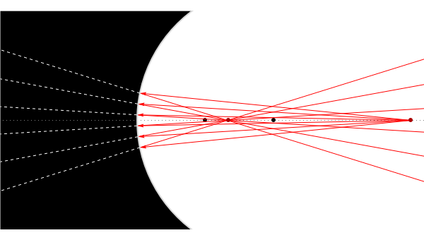 In the paraxial approximation, i.e. in the limit of small angles to the optical axis, the rays emitted by a source and reflected in a spherical mirror, or their extensions, cross at points (the real or virtual images of the source) that appear as new sources to an observer. Rays forming greater angles to the optical axis no longer meet exactly at one point, a phenomenon known as spherical aberration, reducing the quality of the image produced by the mirror. This demonstration shows how the image is formed, also in relation to the dispersion of the rays with respect to the optical axis.