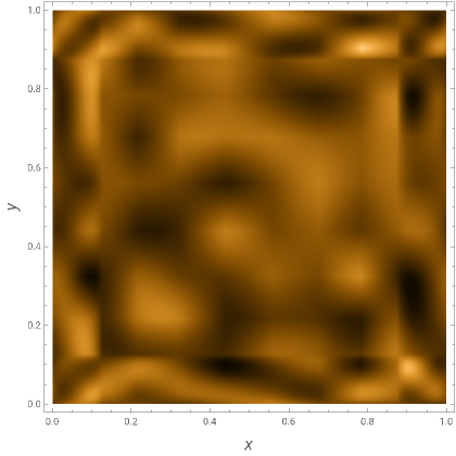 The Chebyshev orthogonal collocation method applied with =14 nodes in both spatial directions transforms the system of two coupled nonlinear PDEs into a system of 392 nonlinear coupled first-order ordinary differential equations. This system of ODEs is solved using the built-in Mathematica command NDSolve. The snapshots show the results for the 2D inhibitor concentration distribution at times and at . It is interesting to note, in particular, the emergence of Turing patterns similar to leopard spots in the concentration distribution at .
