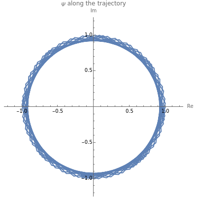 where . Here, as always in quantum theory, the angular velocity of phase rotation is associated with an energy . In the Demonstration code we use the numerical values . The Demonstration lets you visualize the complex quantities and for a discrete trajectory. Such a trajectory is defined by a number of rotation periods and a number of steps per rotation period. You can set both numbers using the sliders; also noninteger values make sense. For less than steps per period one sees singularities for and . Selecting the mode "eigenvalues" shows that then one of these eigenvalues of the step matrix has a modulus larger than 1. The quantities and vanish for the exact solution due to unitarity and energy conservation. They do not vanish exactly for the discrete trajectories defined by the two leapfrog algorithms. They can be inspected under the method "errors". The reason for considering these error measures is that they can also be computed in cases where the exact solution is not available.