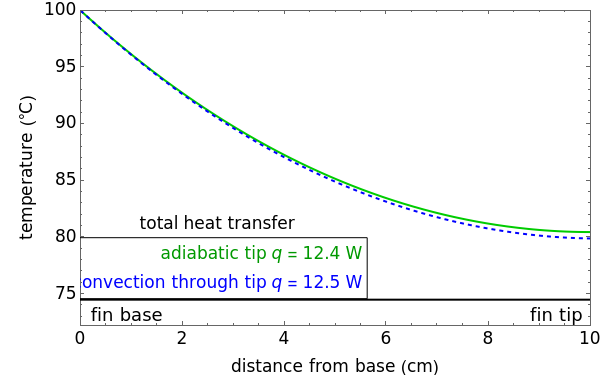 This Demonstration calculates temperature as a function of distance from the base of a fin of uniform cross-sectional area. The fin is attached to a base, which has the same cross-sectional area and is at a constant temperature of 100 °C. Heat loss from the fin is by natural convection to the surrounding air, which is at 25 °C. The rate of heat transfer is calculated for an adiabatic tip (no heat transfer through the tip surface) and for a tip that has heat transfer by convection. The temperature decreases down the fin due to conduction and to heat being lost by convection. The conduction is assumed to be one-dimensional along the length of the fin. Use sliders to vary the dimensions of the fin.