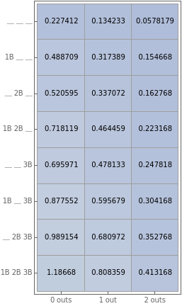 Interactively change probabilities for singles, doubles, triples, home runs, bases on balls, and taking an extra base to generate a run expectancy matrix, which is the expected number of runs for a given base position and a given number of outs.