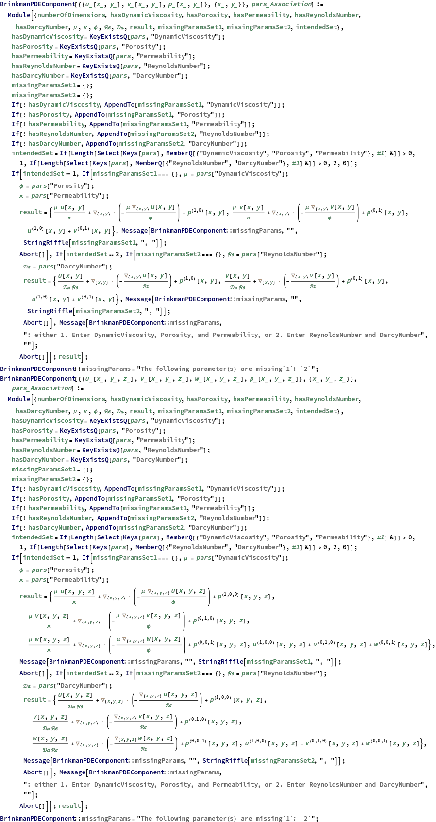 BrinkmanPDEComponent[{{u[x,y,z],v[x,y,z],w[x,y,z],p[x,y,z]},{x,y,z}},<|"DynamicViscosity"->μ,"Porosity"->ϕ,"Permeability"->κ|>]