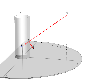 A point of the object is reflected by the mirror toward the observer's eye. The light path forms equal angles with the normal vector , perpendicular to the cylinder at , the intersection with the cylinder of the view line between the viewpoint and the image point .