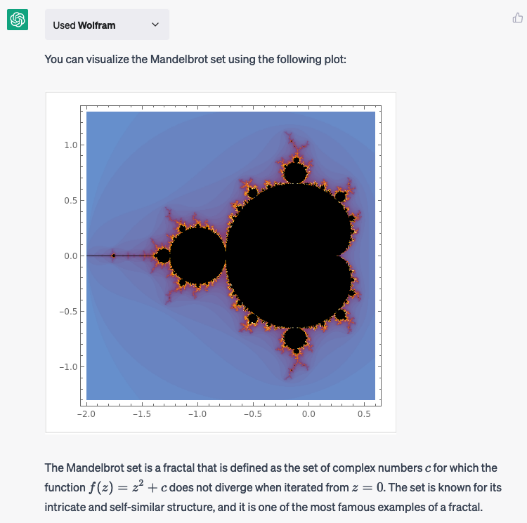 Not a high-res image but you can get visual output back using the Wolfram plugin and the following prompt: visualize the mandelbrot set