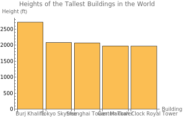 buildingNames={"Burj Khalifa","Tokyo Skytree","Shanghai Tower","Canton Tower","Makkah Clock Royal Tower"};buildingHeights={2717,2080,2073,1982,1972};BarChart[buildingHeights,ChartLabels->buildingNames,AxesLabel->{"Building","Height (ft)"},PlotLabel->"Heights of the Tallest Buildings in the World"]