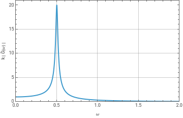 k=1;ωn=1/2;ζ=1/40;AbsGω=;Plot[AbskGω,{ω,0,2},Frame->True,FrameLabel->{"ω","k | (ω) |"},PlotRange->{{0,2},{0,21}},GridLines->Automatic]