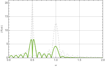 To find the (absolute value) of the Fourier domain representation of the position, (ω), we multiply the absolute values of the Fourier transformation of the force, (ω), and of the response function, (ω). In the plot below, we plot the latter two in dashed gray curves, they product is the green curve.