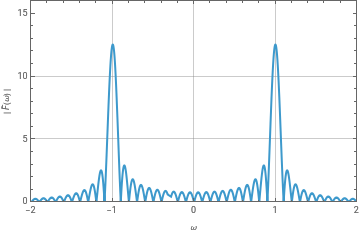 AbsFω=Abs[Fω];Plot[AbsFω,{ω,-2,2},Frame->True,FrameLabel->{"ω","| (ω) |"},PlotRange->{{-2,2},{0,16}},Axes->False,GridLines->Automatic]
