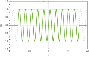 Ft=Sin[t]UnitBox;PlotSin[t],UnitBox,Ft,{t,-15π,15π},Frame->True,FrameLabel->{"t","F[t]"},PlotRange->{{-40,40},{-3/2,3/2}},Axes->False,GridLines->Automatic,PlotStyle->{{LightGray,Dashed},{LightGray,Dashed},}