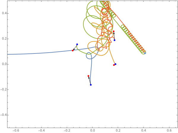 This Demonstration shows a two-dimensional version of the -body problem, in which different masses interact gravitationally. In order to predict their motions, a system of coupled differential equations must be solved consistent with a set of initial conditions for positions and velocities that are chosen at random.