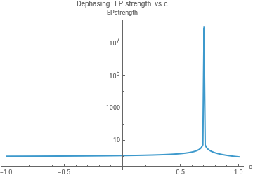 cGrid=Range[-1,1,0.01];(*chooseONE:Lfun=LdephorLrelax*)params=<|"gamma"->1,"Delta"->0.5,"J"->0.3|>;LfunDeph[c_]:=Ldeph[params["J"],params["gamma"],c];LfunRelax[c_]:=Lrelax[params["Delta"],params["gamma"],c];dataDephStrength=Table[{c,epStrength[LfunDeph[c]]},{c,cGrid}];dataRelaxStrength=Table[{c,epStrength[LfunRelax[c]]},{c,cGrid}];ListLogPlot[dataDephStrength,Joined->True,PlotRange->All,AxesLabel->{"c","EPstrength"},PlotLabel->"Dephasing: EP strength vs c"]ListLogPlot[dataRelaxStrength,Joined->True,PlotRange->All,AxesLabel->{"c","EPstrength"},PlotLabel->"Relaxation: EP strength vs c"]params