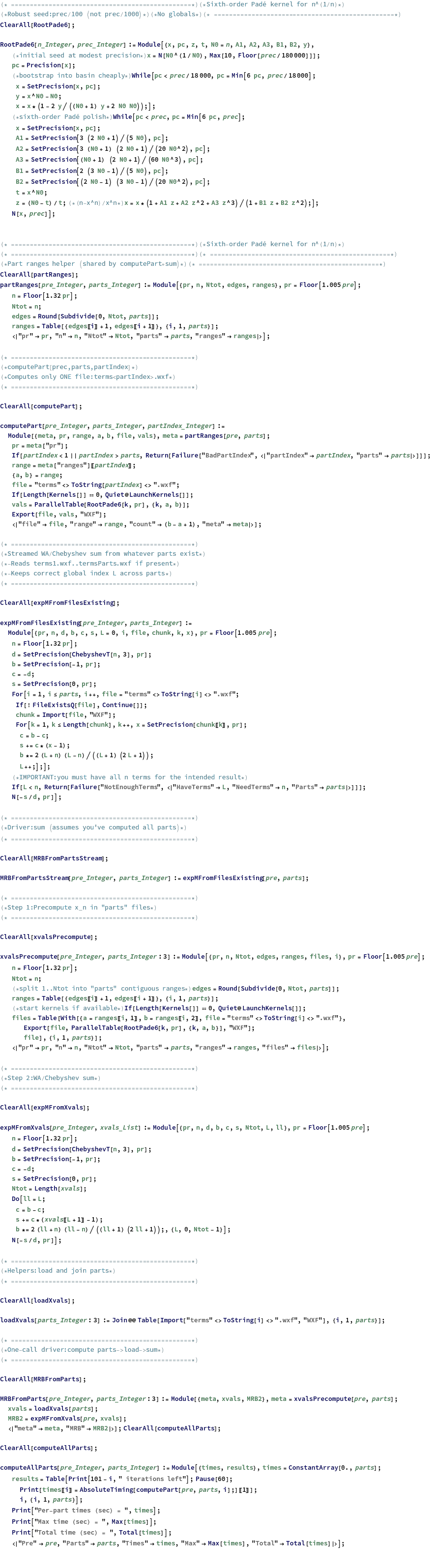(*Max[Join[AbsoluteTiming[Print[AbsoluteTiming[computePart[10000,5,1];][[1]],AbsoluteTiming[computePart[10000,5,2];][[1]],AbsoluteTiming[computePart[10000,5,3];][[1]],AbsoluteTiming[computePart[10000,5,4];][[1]],AbsoluteTiming[computePart[10000,5,5];][[1]]]]]]*)(*MRB2=MRBFromPartsStream[10000,5];N[mtest-MRB2,30]*)
