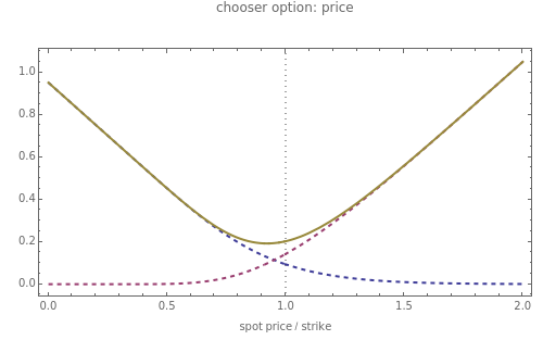 Chooser options are a type of exotic option that, at some pre-specified time in the future, can be converted into either a put or call option with expiry > and strike . The price of a chooser option, , thus tends to be higher than that of the corresponding call or put, or . The amount of extra value depends on and : for ≪, is approximately . As tends to , tends to +.