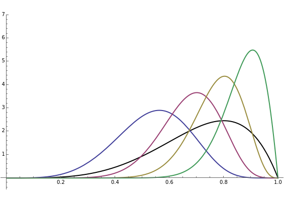 If independent values are drawn from some distribution and ordered from smallest to largest, the value is the order statistic. The distribution of this value depends on both the underlying distribution and the size of the sample, . In this Demonstration, you can choose among four probability distributions on the unit interval and view the distributions of the order statistics for that distribution for samples of various sizes. Mouse over the curves to view the means of the various distributions in the image.