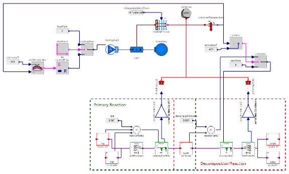 The chemical reaction system is modeled with detailed kinetic equations, capturing temperature-dependent reaction rates, heat generation, and cooling mechanisms. The model accounts for real plant constraints and dynamic feedback.