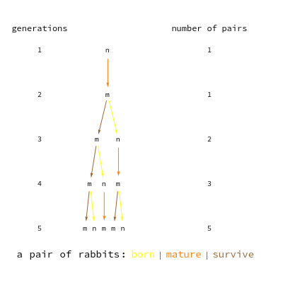 Suppose a pair of rabbits, one male and one female, start a family. Rabbits mature at the age of one month (labeled "m") and a female produces a new pair of rabbits (labeled "n") at the end of its second month.
