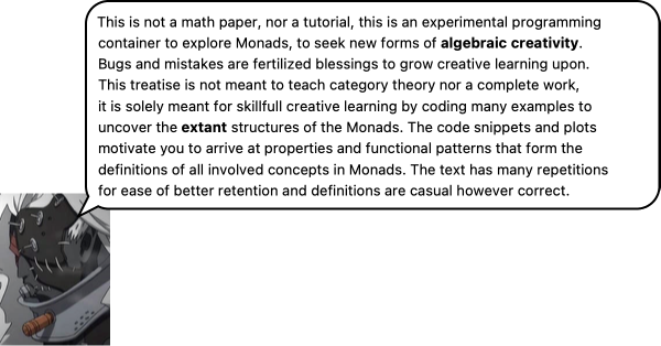 ● Monads are not monsters they can be anything you want them to be, since with their imbued categoricity, a Monad can easily shape-shift from one multiplicative product to another, shape shift from one algebra to another, and as a matter of fact you could discover new such products on your own during the interactive codexplanations below.