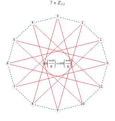 The group of integers modulo under addition is shown as points on a circle. The red lines show the cyclic subgroup generated by the element . The points on the circle are the roots of unity, which are given by the points in the set ={z∈|=1}. These roots are given by the formula in the center for .