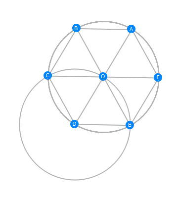 GeometricScene[{{A.,D.,O.,C.,E.,B.,F.},{}},{{CircleThrough[{A.,D.},O.],Line[{A.,O.,D.}]},{CircleThrough[{O.,C.,E.},D.],C.∈CircleThrough[{A.,D.},O.],E.∈CircleThrough[{A.,D.},O.],GeometricAssertion[{C.,E.},"Distinct"]},{Line[{{E.,O.,B.},{C.,O.,F.}}],B.∈CircleThrough[{A.,D.},O.],F.∈CircleThrough[{A.,D.},O.]},{Line[{{A.,B.},{B.,C.},{C.,D.},{D.,E.},{E.,F.},{F.,A.}}]}},{GeometricAssertion[{Polygon[{A.,B.,C.,D.,E.,F.}]},"Regular"]}]
